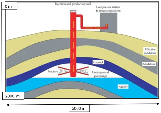 Below is a cartoon of the gas storage scheme. Normally the engineer chose a depleted gas reservoir, where reservoir pressure is low, so that it is easy to inject gas, and good permeability to deliver gas high rate of gas at short notice.